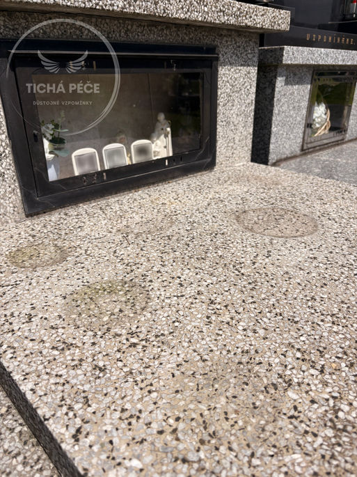 Na fotografiích můžete vidět stav urnového hrobu před a po našem zásahu. Provedli jsme kompletní čištění mramorových i žulových částí, odstranili nečistoty, mech a usazeniny. Součástí práce bylo také důkladné vyčištění prosklené vitríny, aby opět vynikla její původní čistota a lesk.