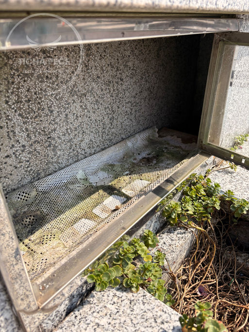 Fotografie zachycují stav dvojhrobu před a po vyčištění. Mramorové části byly pečlivě očištěny od nečistot a povlaků. Zvláštní pozornost jsme věnovali i vnitřní části skleněné vitríny, která byla silně znečištěná – po umytí je opět čistá a průhledná.